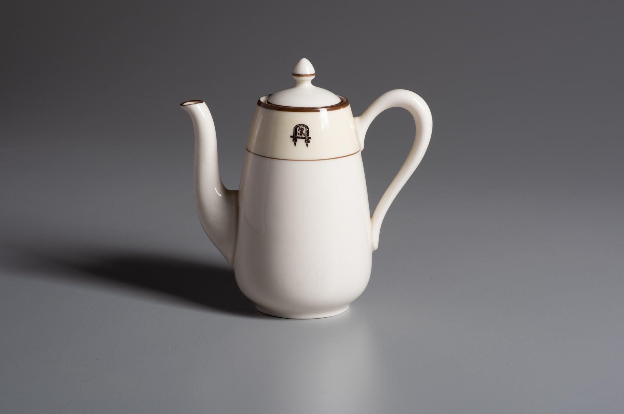 Stickley's shop mark in brown on body (compass surrounding "Als ik Kan.") On base of pot, Lenox shopmark ("L" in wreath / "LENOX") in green.