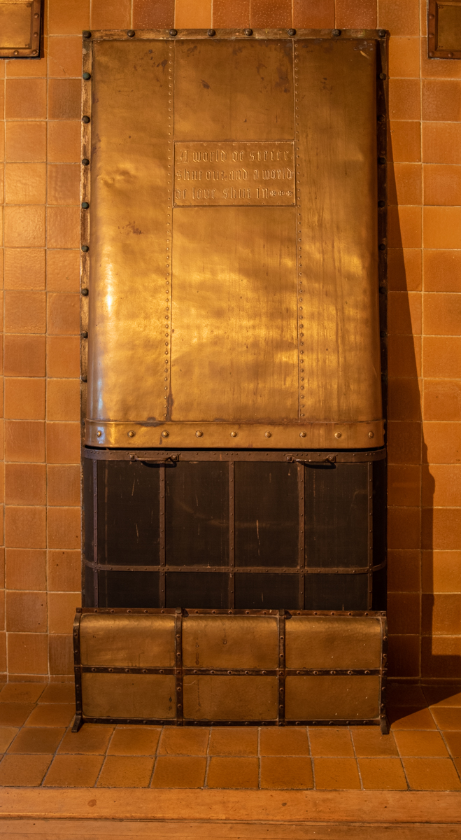 For the master bedroom, Stickley revealed a romantic side of himself that contrasts starkly with the professional persona he projected downstairs. Using the poem “Home” by Victorian poet Dora Greenwell, he adapted the last couplet to read “A world of strife shut out and a world of love shut in” for his personal hearth. The poem is a panegyric to romantic love that reads: