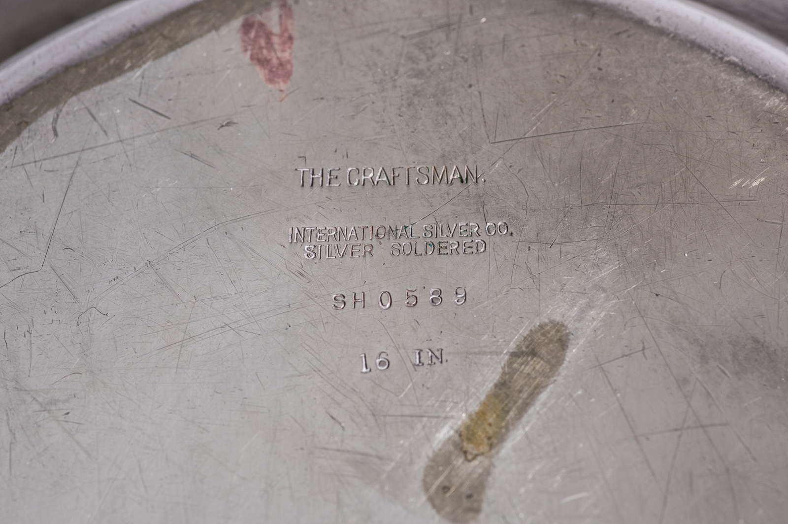 Impressed on back: "THE CRAFTSMAN." / "INTERNATIONAL SILVER CO." / "SILVER SOLDERED" / "SH0589" / "16 IN.", etched or engraved "Als ik Kan" shop mark on front.