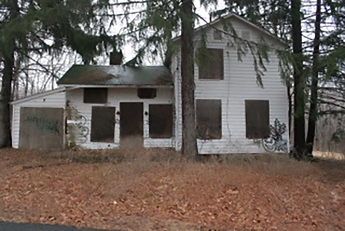 Photograph of the Elmer Farmhouse showing the extent of vandalism and condition of disrepair shortly before it was taken down. The shorter section of the house (on the left) is the earliest part, while the taller section was added probably in the later 19th century.
