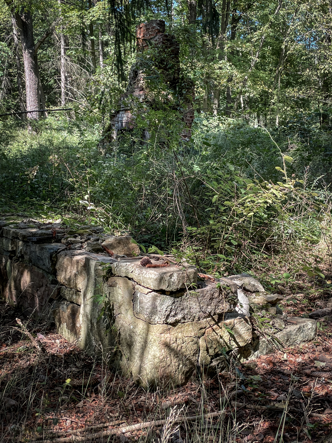 Remains of the foundation and chimney stack from the Elmer farmhouse, 2021.