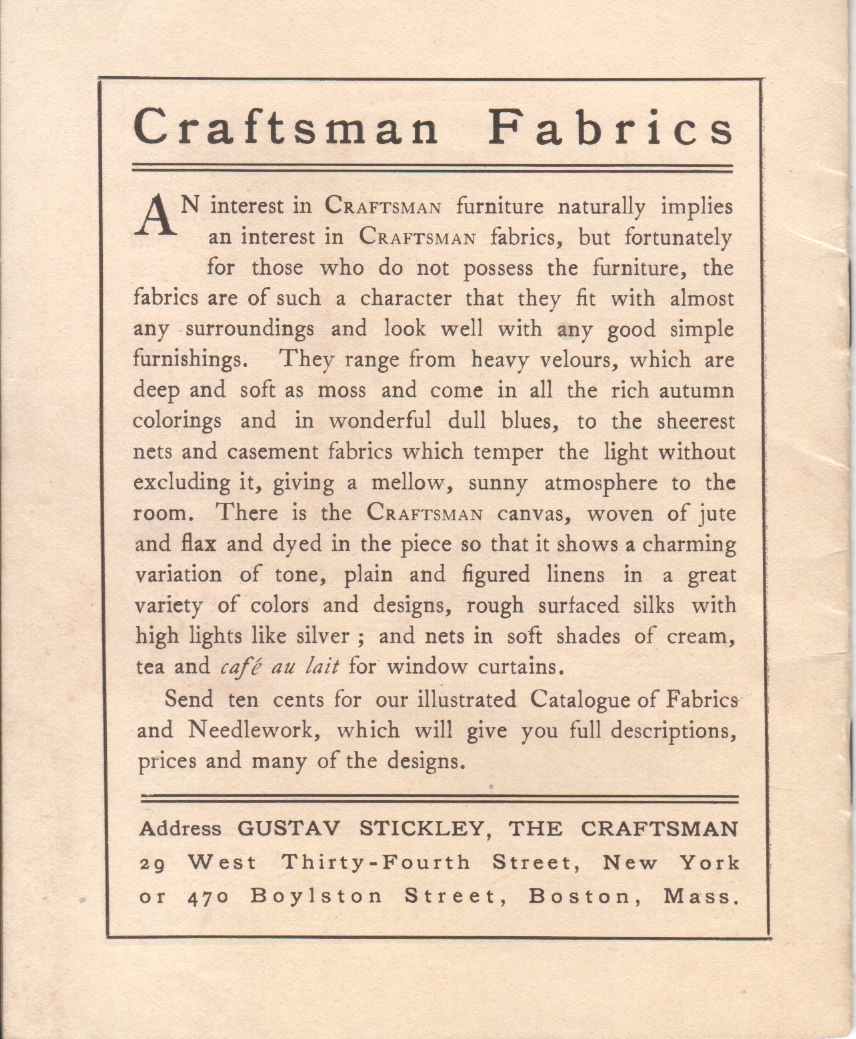 Though undated, the range proposed for this catalog is based on a number of factors. The first is the New York City address, given as 29 West 34th Street, indicating that the catalog was published prior to his leasing of the Craftsman Building in 1913. Second, the Boston retain shop–whose address is also noted–was opened in 1908.
