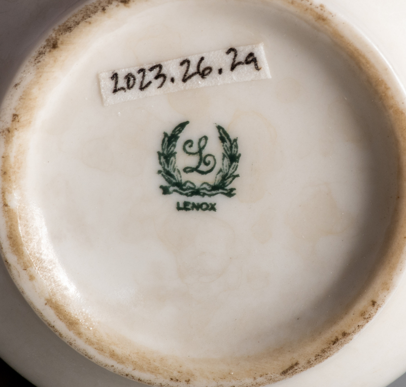 Stickley's shop mark in brown on body (compass surrounding "Als ik Kan.") On base of pot, Lenox shopmark ("L" in wreath / "LENOX") in green.
