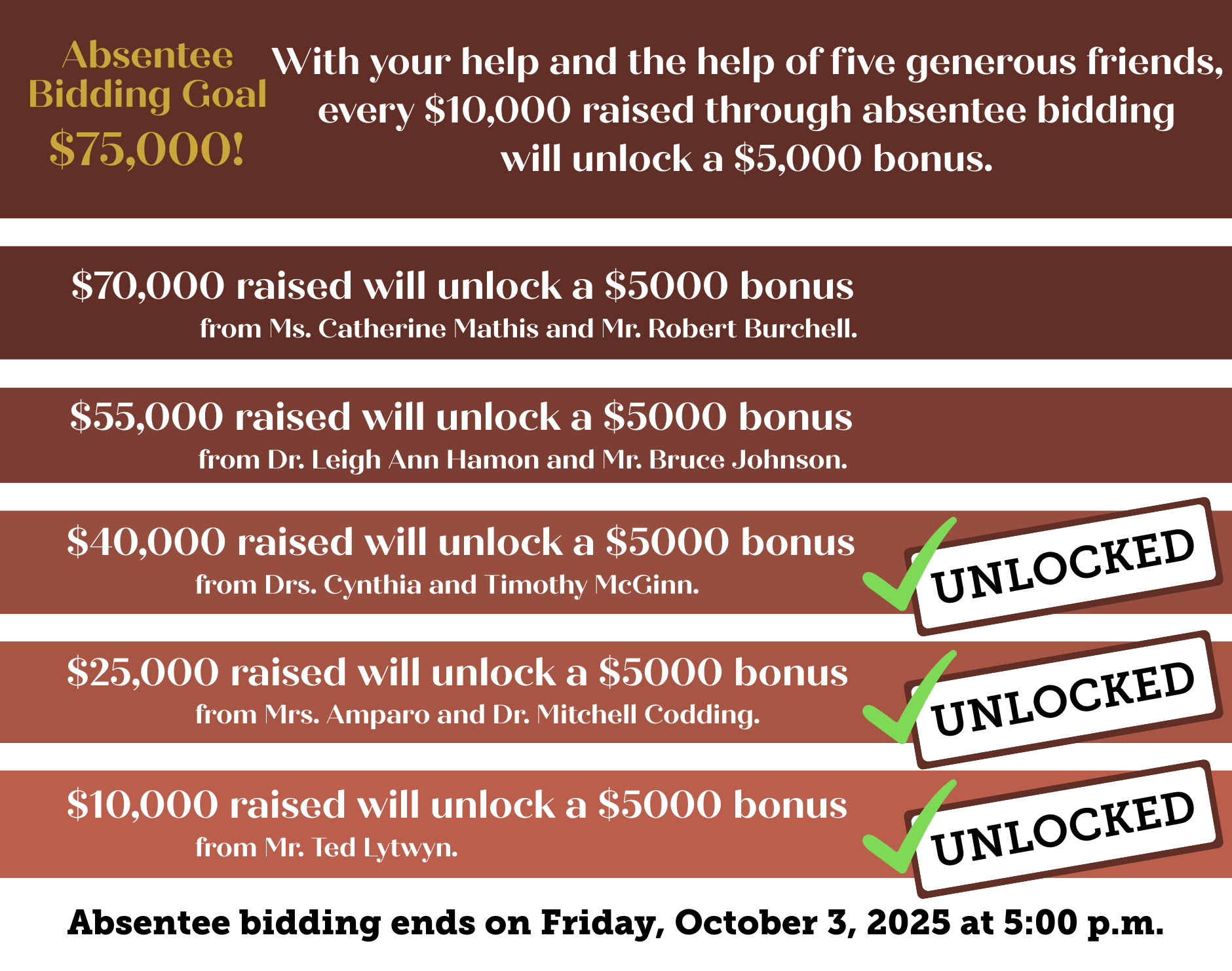 Click the button below to make an absentee bid to the Reverse Auction! Absentee bidding ends on Friday, October 3, 2025 at 5:00 p.m.