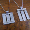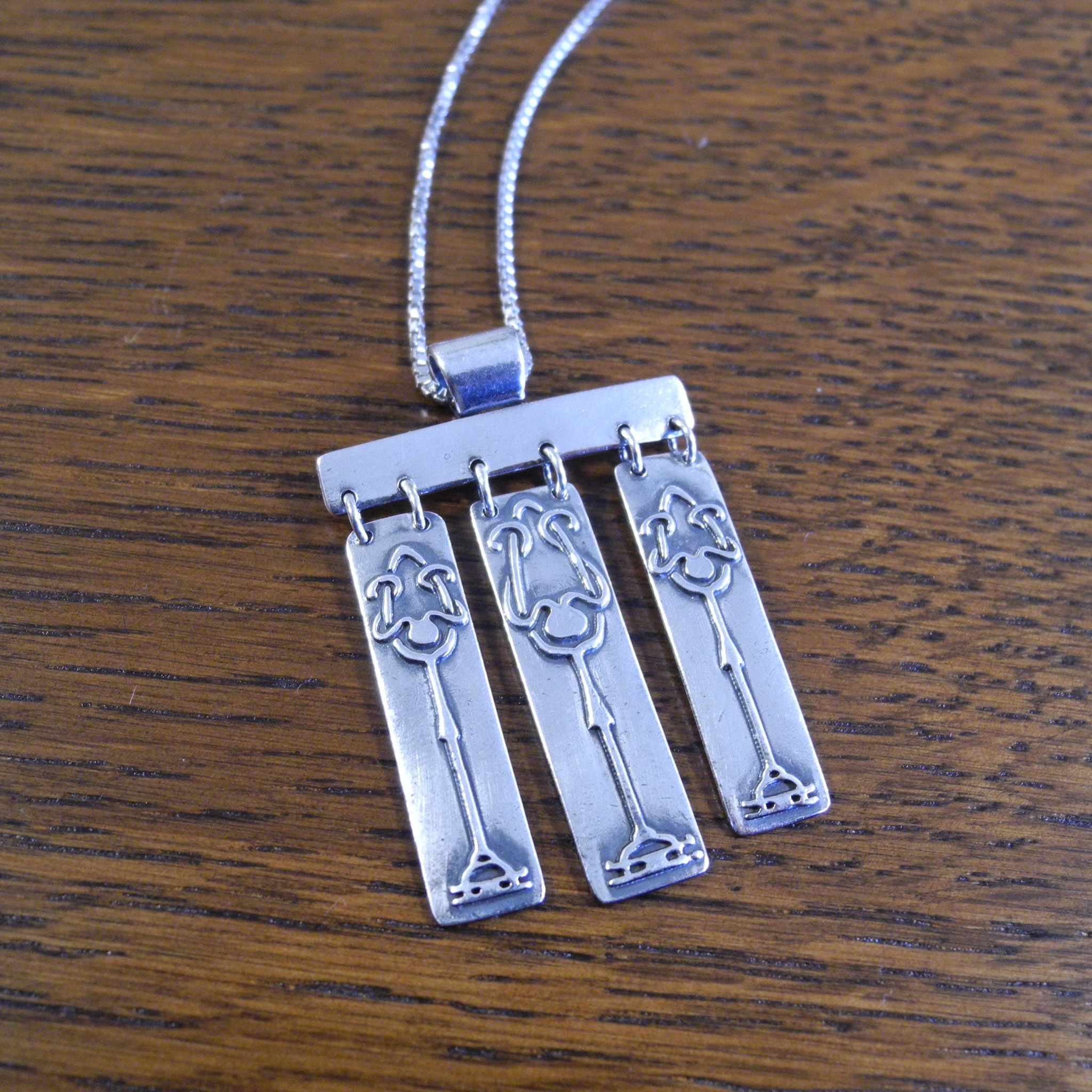 This design was adapted from the inlay panels found on the armchair and rocker in the Stickley Museum at Craftsman Farms. Choose between an articulated pendant design, with fixed bails that adds movement and whimsy to the design, or the bold static pendant design that is fixed. These armchair inlay inspired pendants also match the earrings available here.