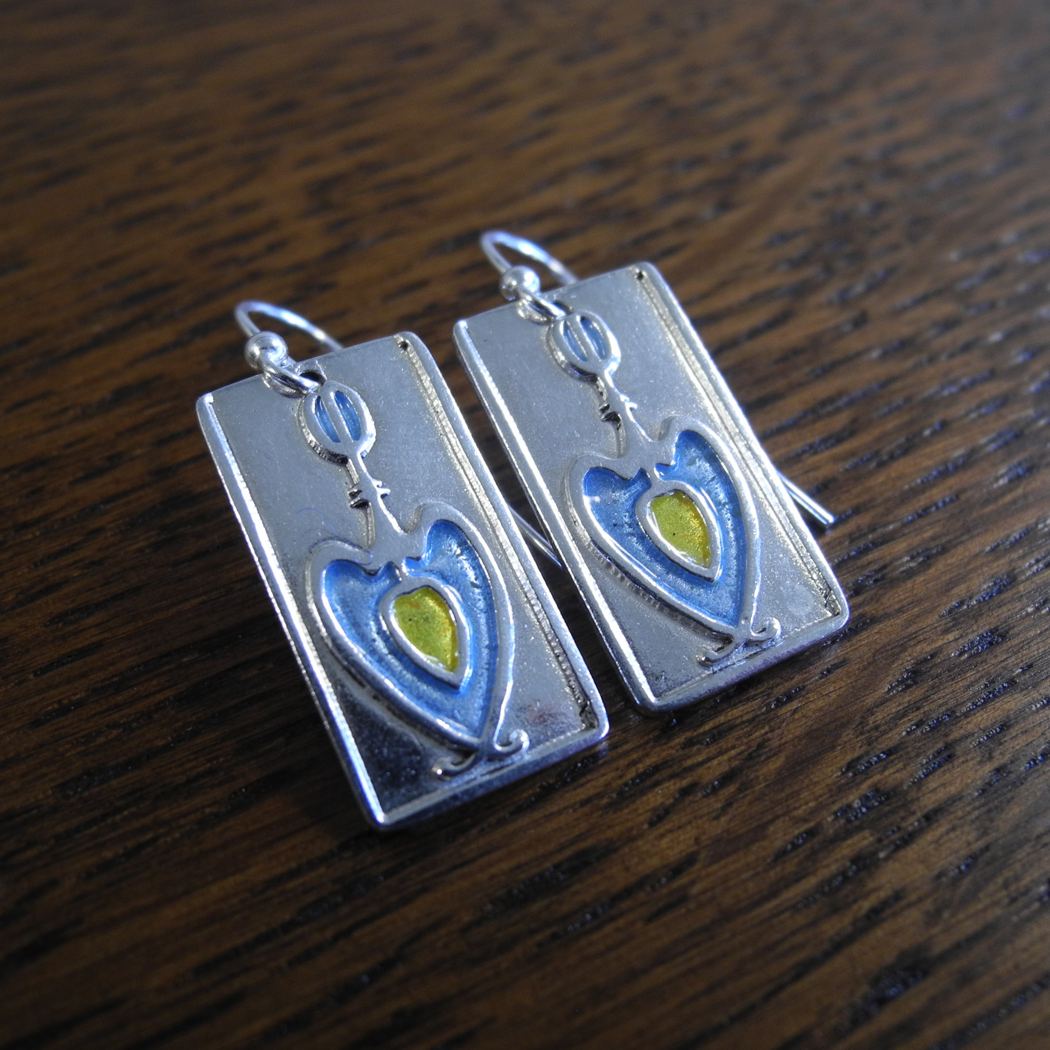 The inlay that inspired this design can be found on the suite of bedroom furniture that was custom made for Gustav Stickley’s daughters’ bedroom at Craftsman Farms. This design has been filled with a beautiful light blue and golden yellow enamel to accentuate the inlay forms. These rectangular earrings match the articulated necklace available here.