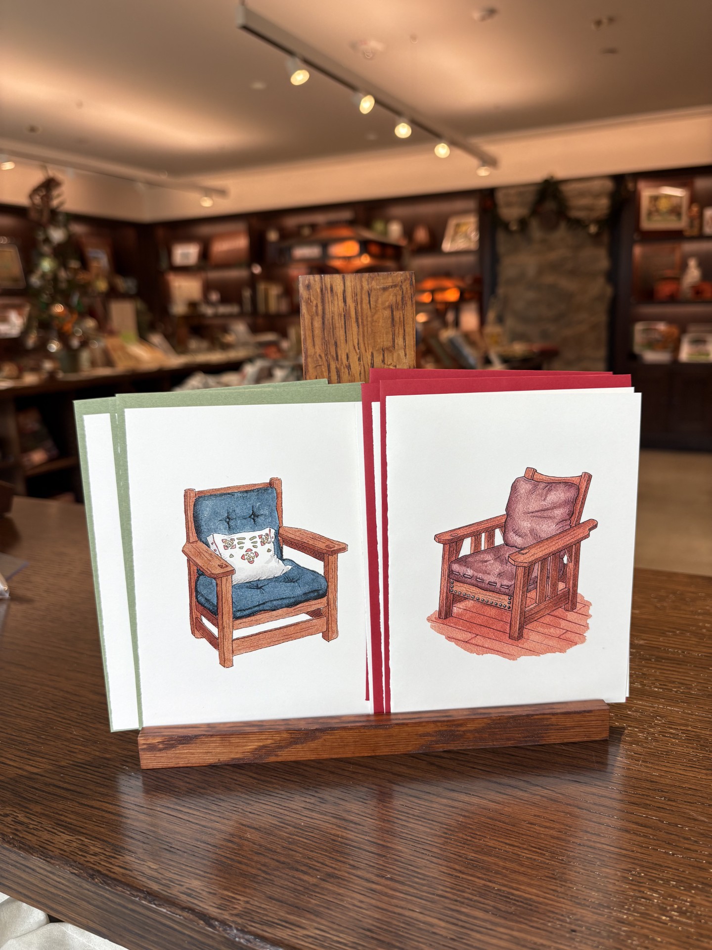 These (6) blank greeting cards feature a lovely winter scene of the Log House at Craftsman Farms created by artist Anna Szalc. These cards capture how the Log House may have looked one winter day when the Stickley Family lived here. Red satin bows hang from the wreaths that adorn the windows and the evergreen garland that drapes on the stone in front of the Log House. The fireplaces warm the house and smoke spills from the chimneys. The windows are aglow. A sled leans against the house and footprints lead up the hill and into the house. The day is still as the deer watches from a distance and the cardinals play in the tree.