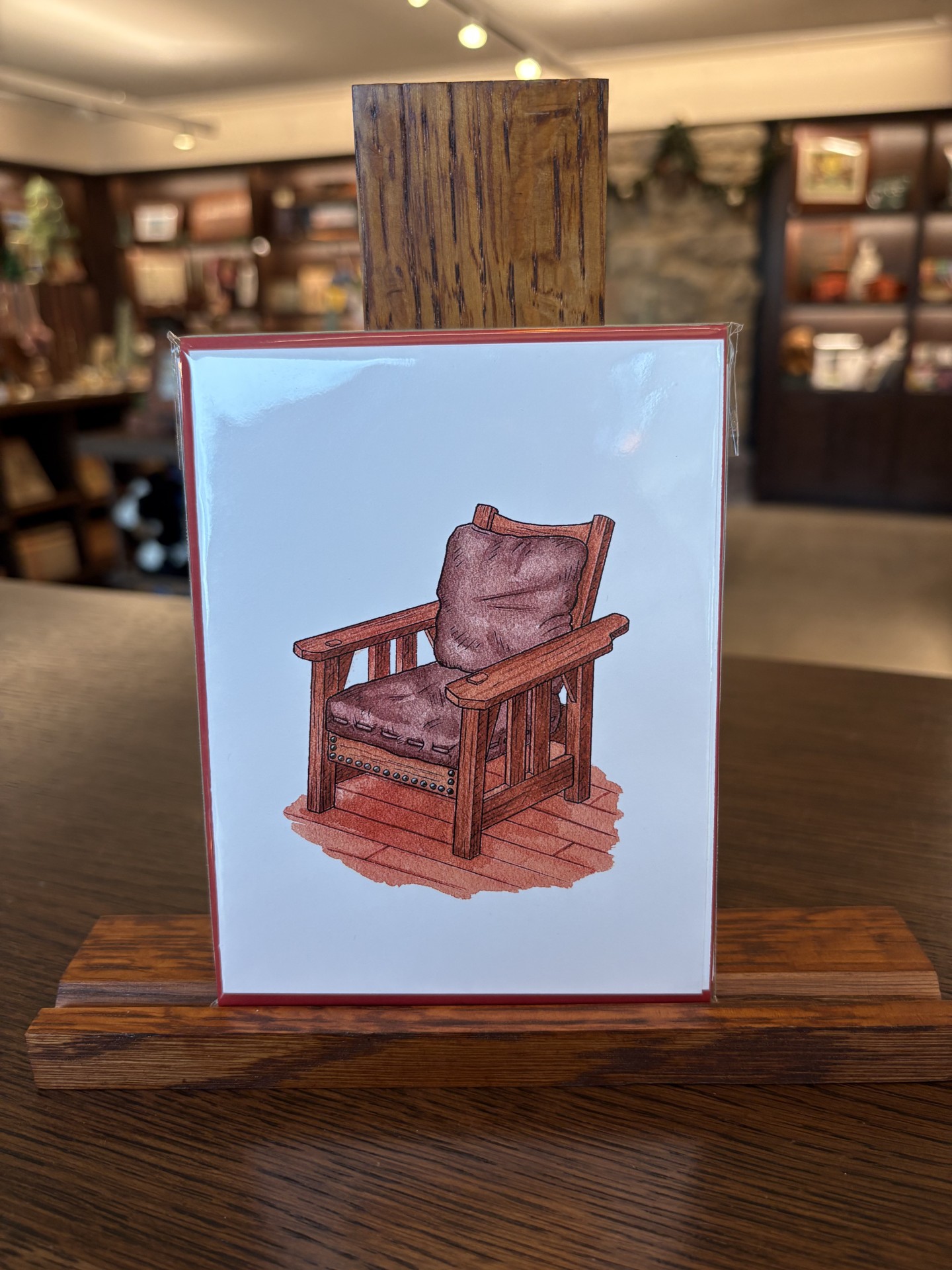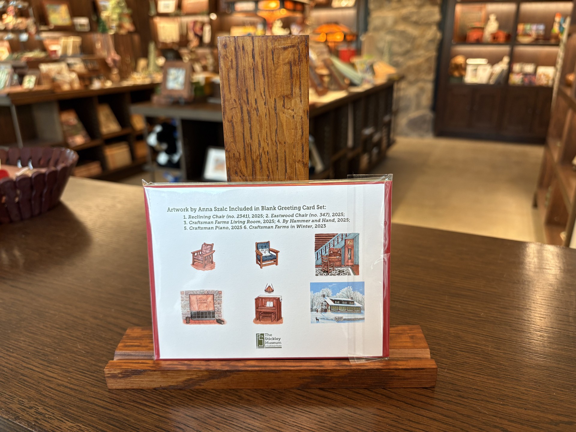 These (6) blank greeting cards feature a lovely winter scene of the Log House at Craftsman Farms created by artist Anna Szalc. These cards capture how the Log House may have looked one winter day when the Stickley Family lived here. Red satin bows hang from the wreaths that adorn the windows and the evergreen garland that drapes on the stone in front of the Log House. The fireplaces warm the house and smoke spills from the chimneys. The windows are aglow. A sled leans against the house and footprints lead up the hill and into the house. The day is still as the deer watches from a distance and the cardinals play in the tree.