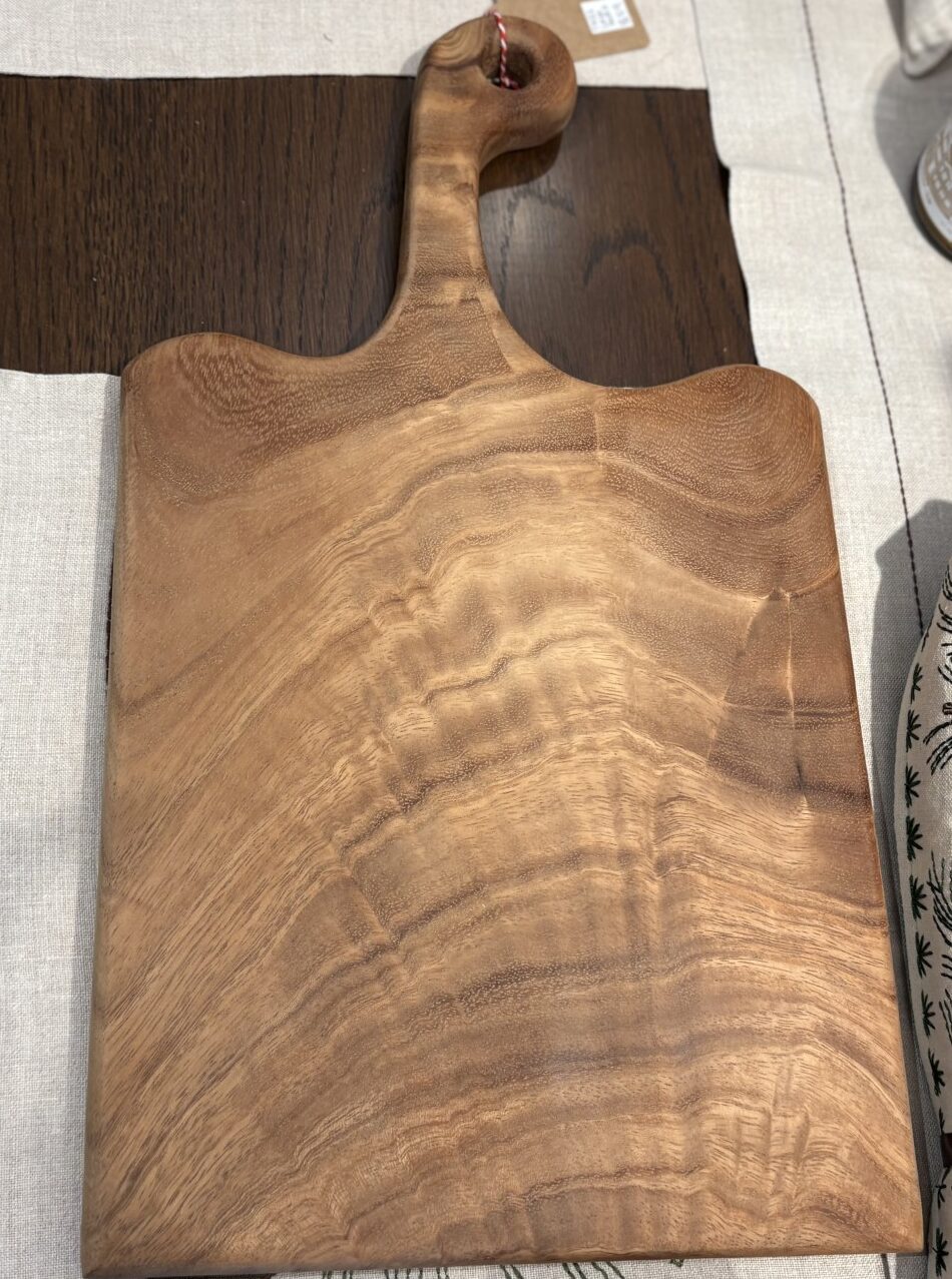 These beautiful, all dark-grained boards are made from one solid piece of East Indian Walnut. The intricate grain patterns mean each board is truly one-of-a-kind. Large handled boards measure approximately 18” x 10” x 1.” These fully reversible boards are perfect for charcuterie, chopping or cutting, even serving – the applications are countless.