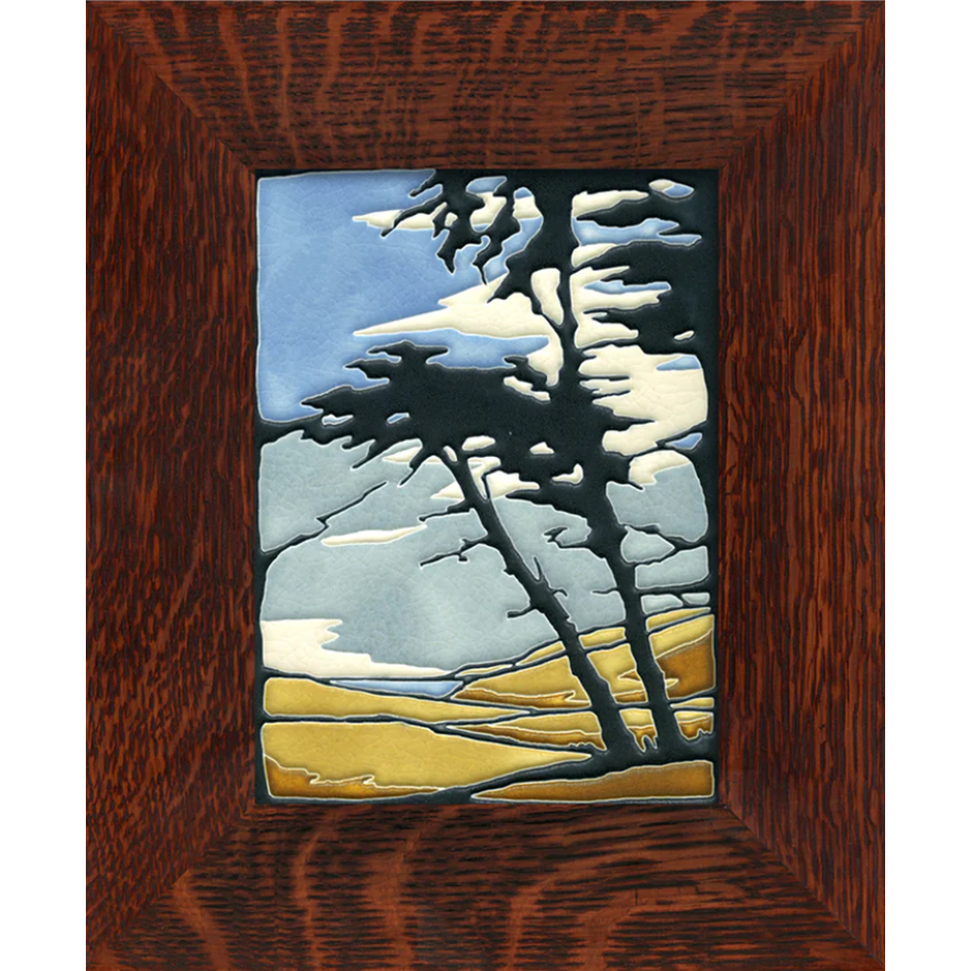 The 6×8″ tile is finished in a Dard Hunter Studios Oak Park frame made of quartersawn oak. Its finished size is 9-1/2 x 11-1/2″.