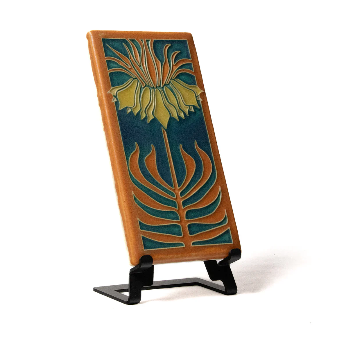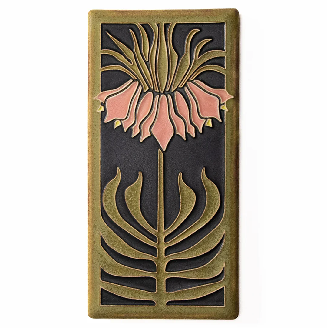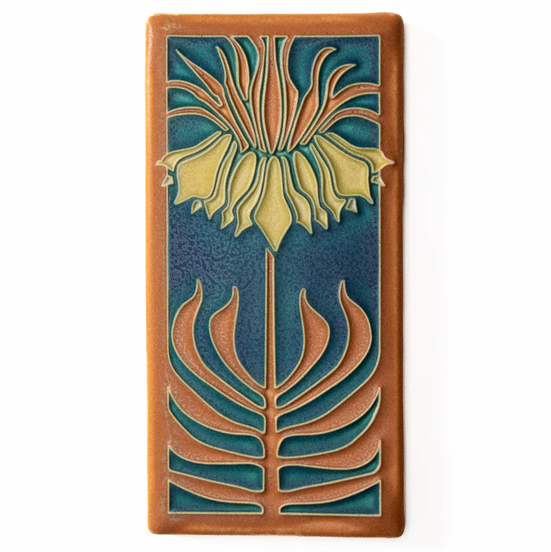 The crown imperial flower, also known as the Persian lily, grows in our gallery garden. In addition to that environmental inspiration, this 4×8 tile design is based on an art nouveau image Nawal Motawi discovered in a book.