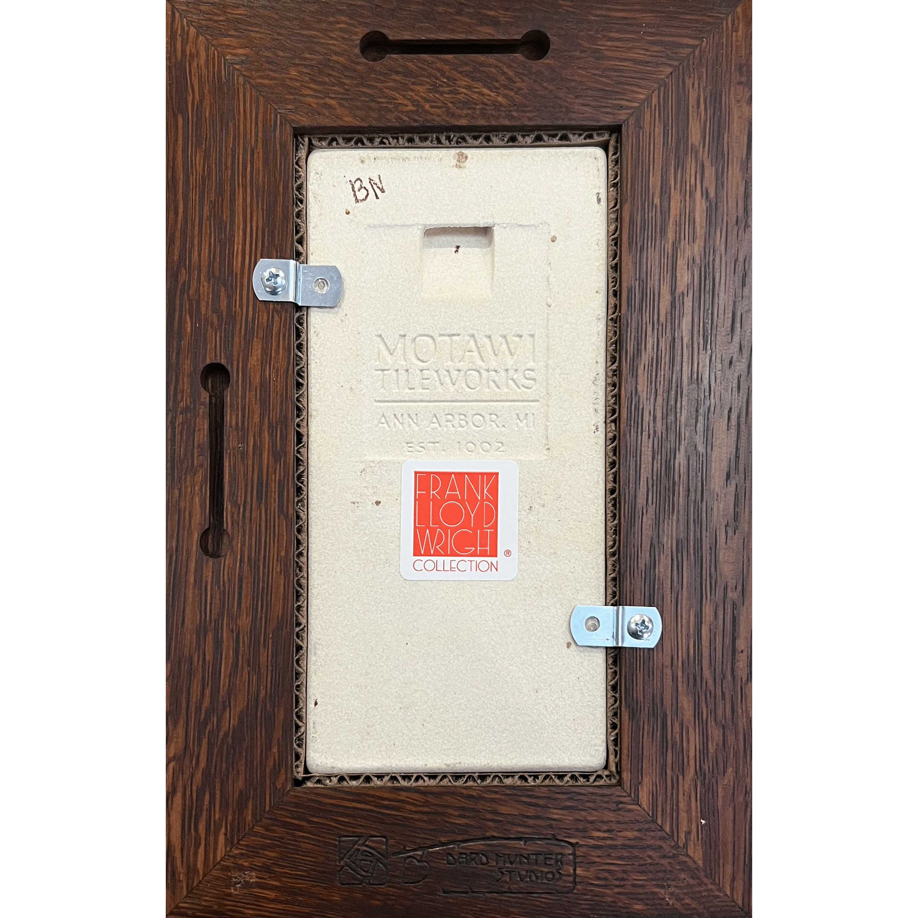 This 4 × 8″ tile is finished in a Dard Hunter Studios Oak Park frame made of quartersawn oak. Dard Hunter Studios was founded by early Roycrofter Dard Hunter and is currently run by his grandson, Dard Hunter III. Its finished size is 9 1/2 x 11 1/4″.