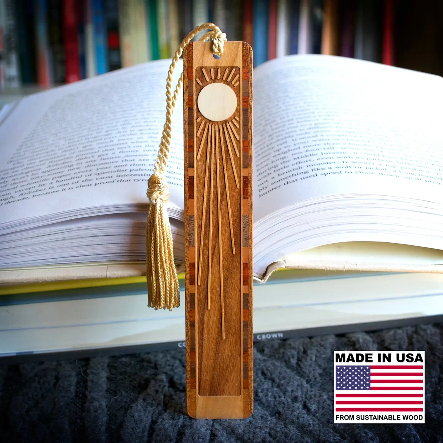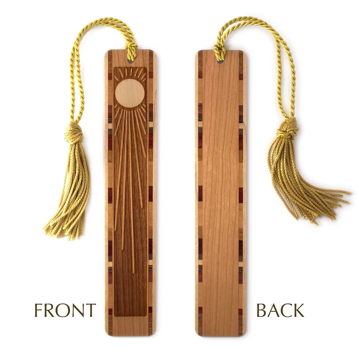 Framed by intricate inlays made from a variety of domestic and exotic hardwoods, each bookmark features unique accent wood combinations, complemented by solid wood borders along both outer edges. This variation ensures every piece is truly one-of-a-kind. A gold tassel adds to the theme of the bookmark.